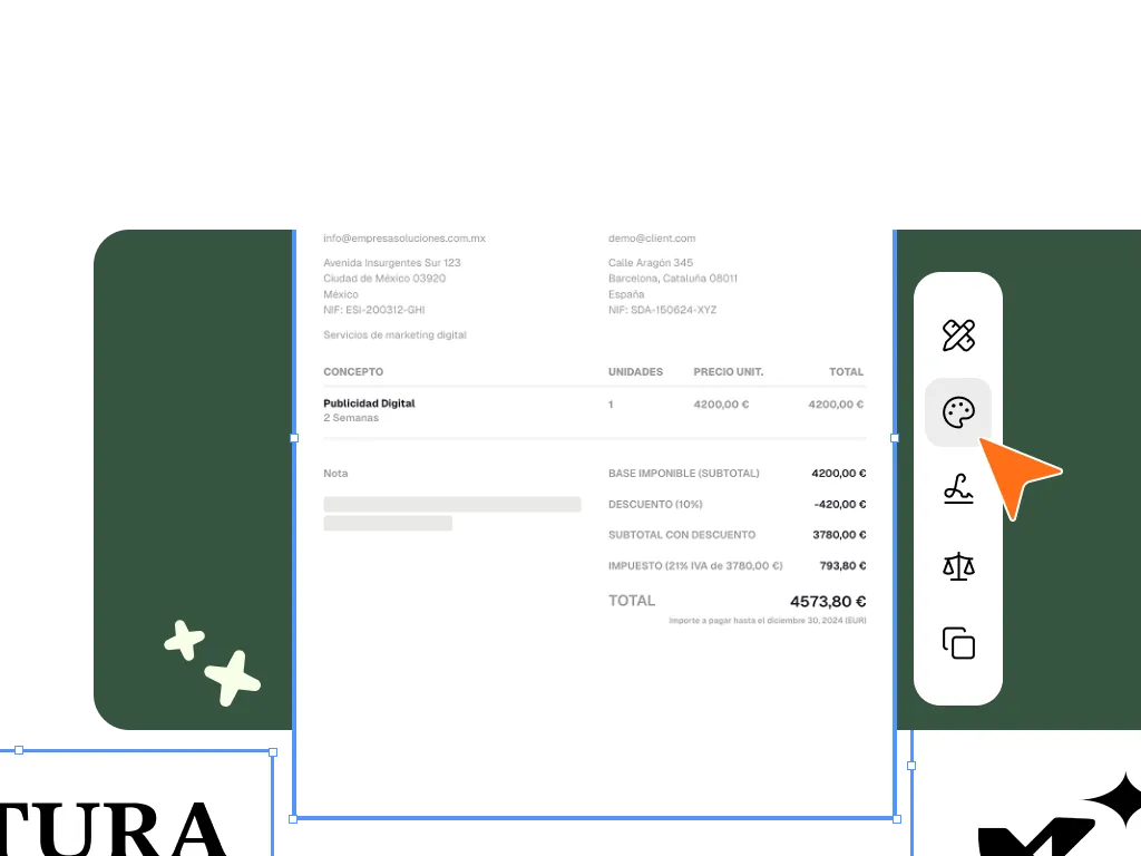 Respeta la coherencia visual de tu marca y refuerza la confianza de tus clientes con herramientas profesionales para crear presupuestos y facturas personalizadas a tu gusto.